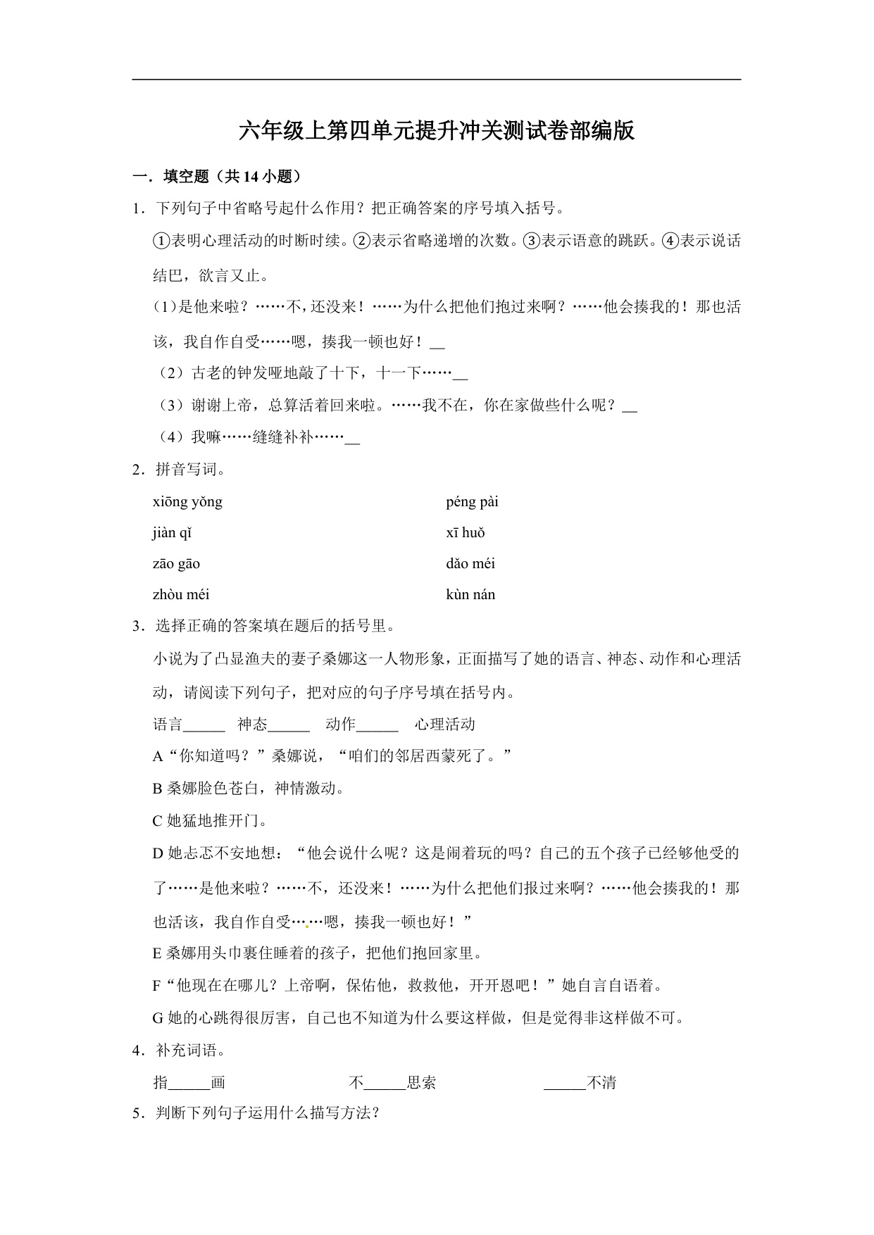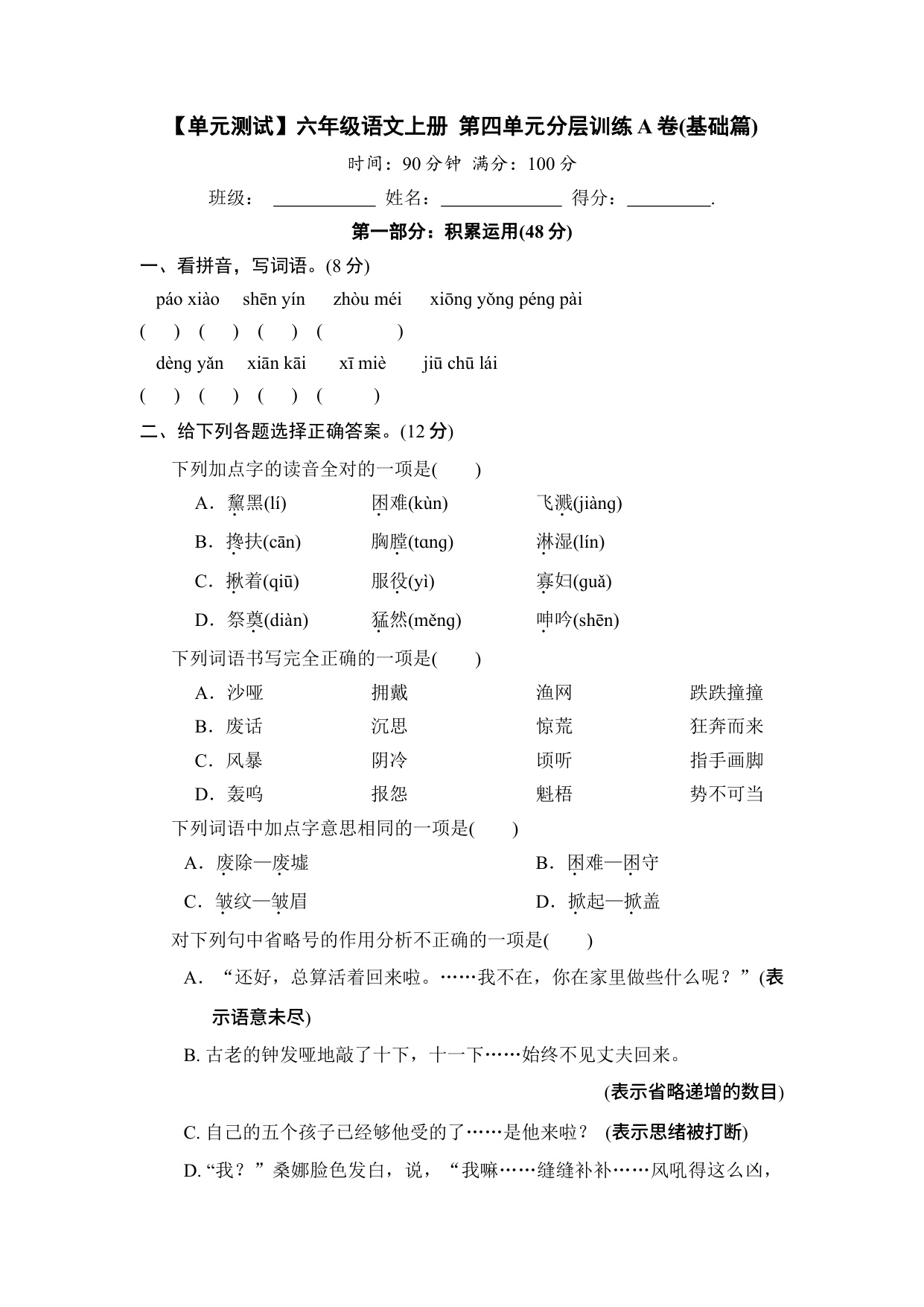 【单元测试】六年级语文上册 第四单元分层训练B卷(提升篇)(部编版 含答案)