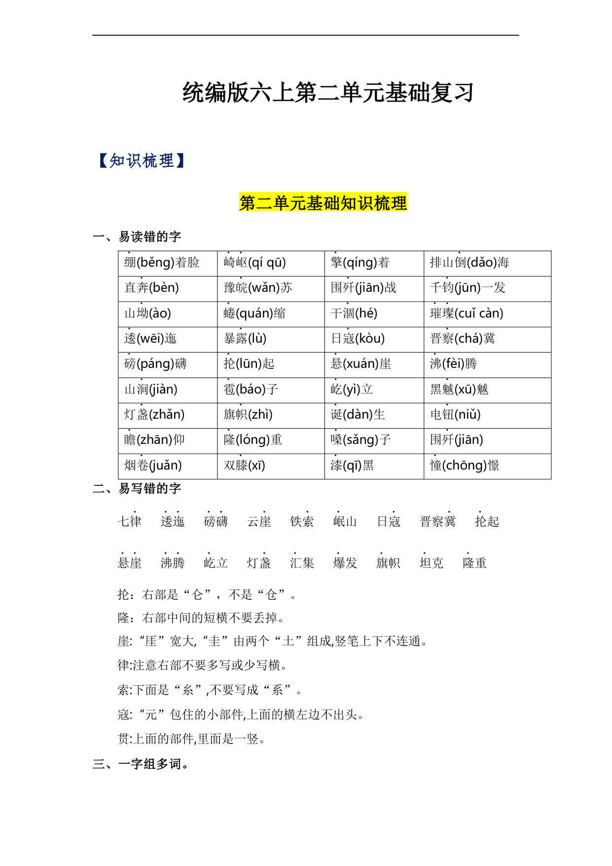 第二单元(知识清单)-六年级语文上册单元(部编版)
