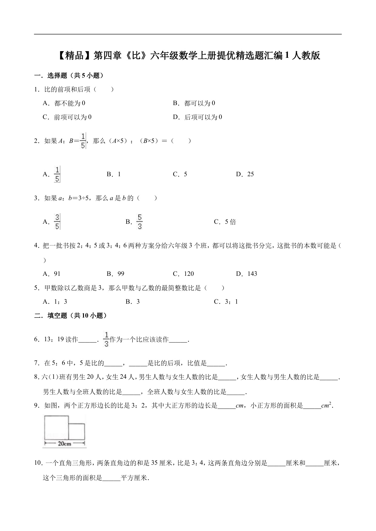 【精品】第四章《比》六年级数学上册单元提优精选题汇编2 人教版(含答案)