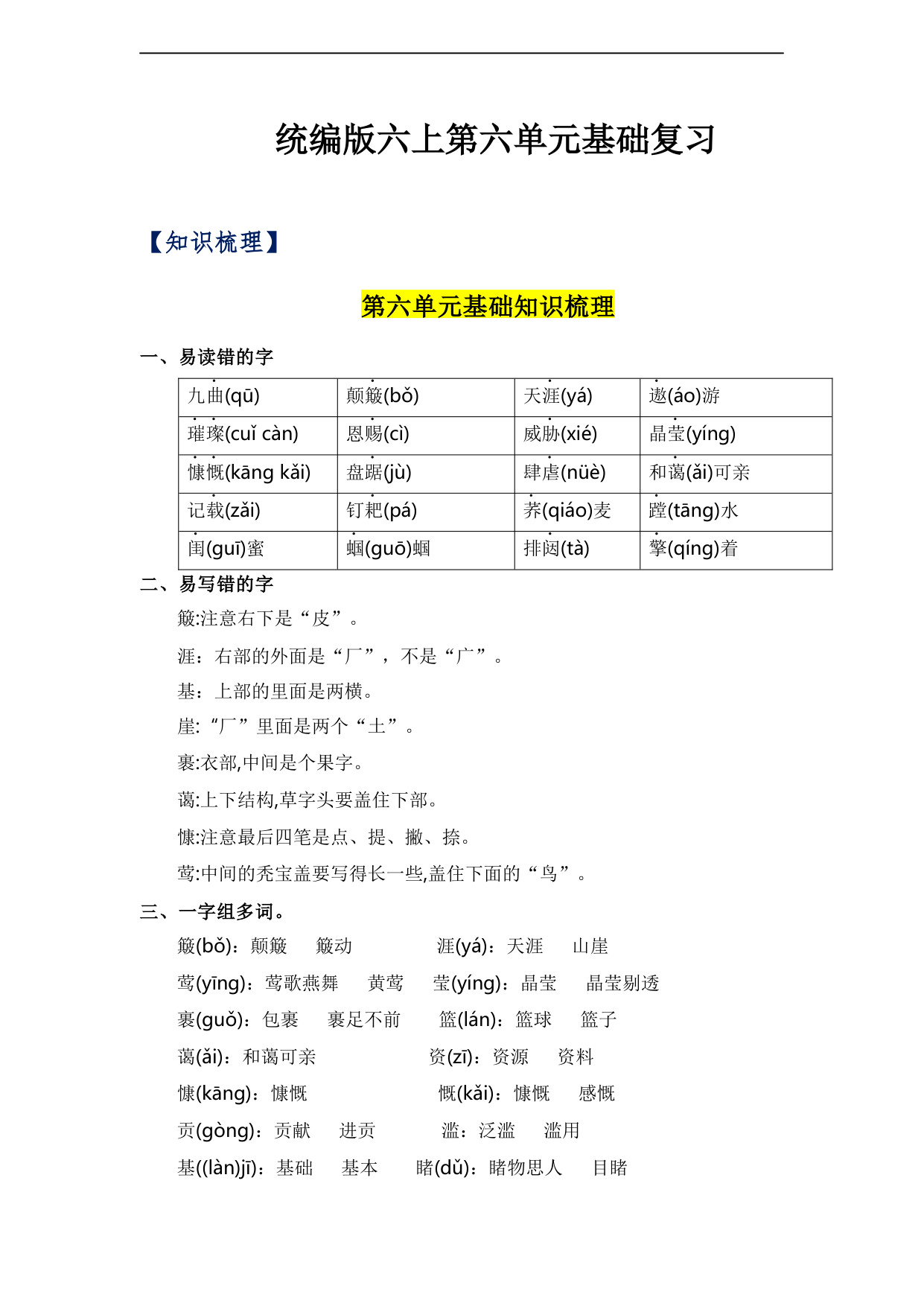 第六单元(知识清单)-六年级语文上册单元(部编版)