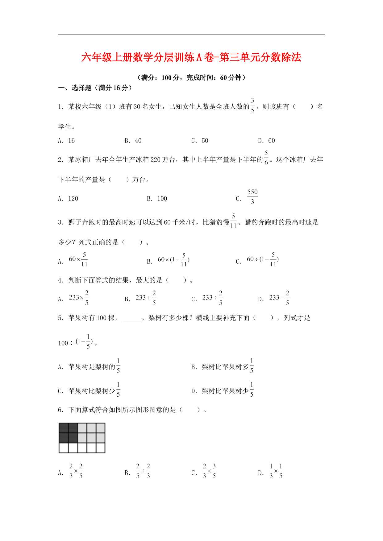 【单元AB卷】六年级上册数学分层训练B卷-第三单元 分数除法(单元测试) (人教版,含答案)