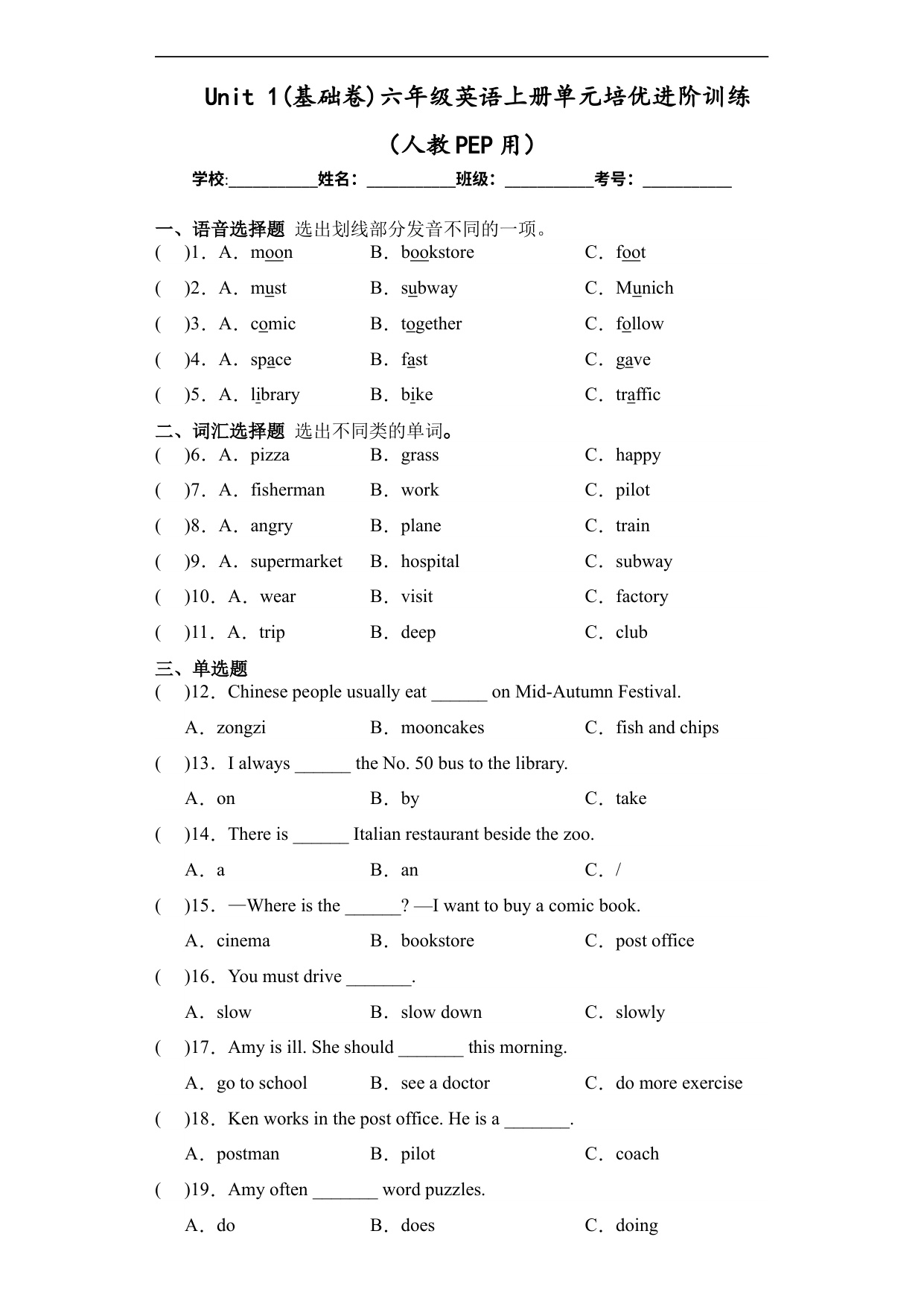 Unit 2(基础卷)六年级英语上册单元培优进阶训练(人教PEP用)