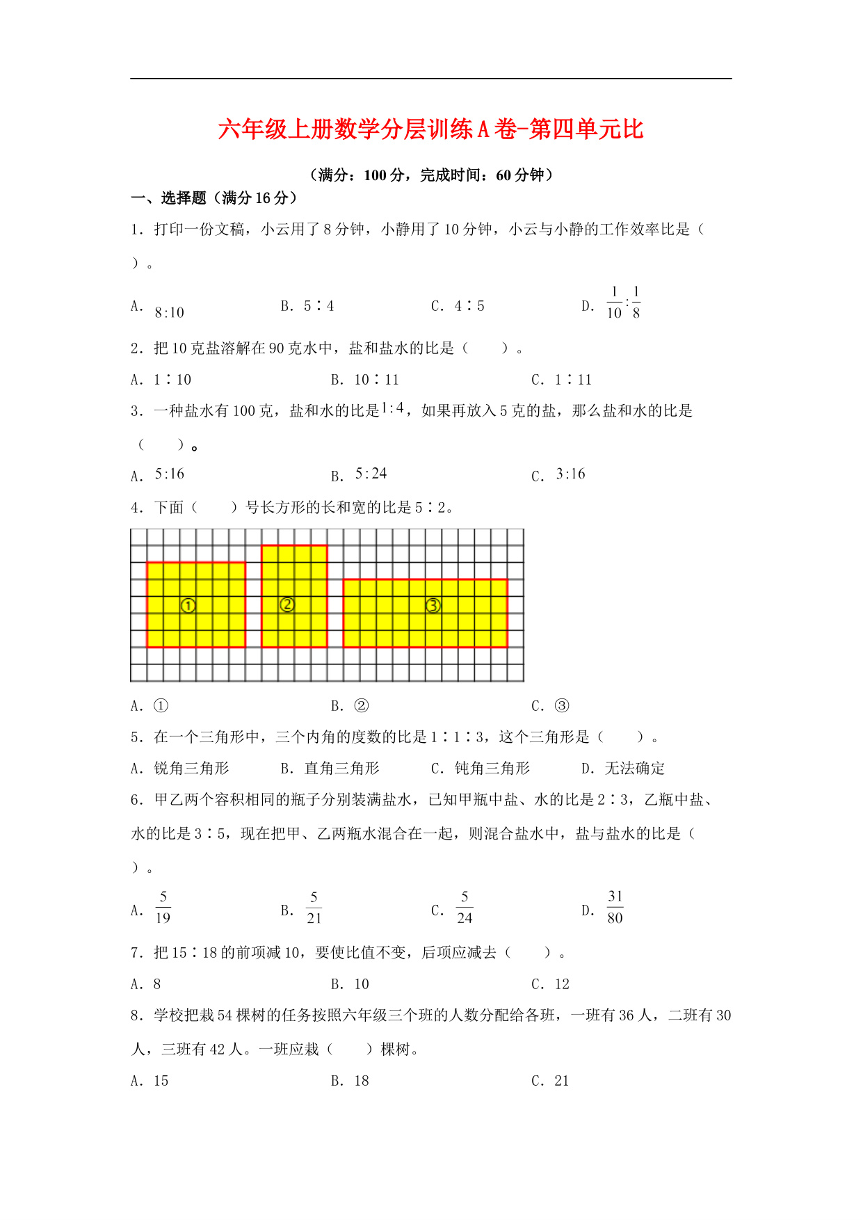 【分层训练】人教版六年级数学上册第三单元测试基础卷(有答案)