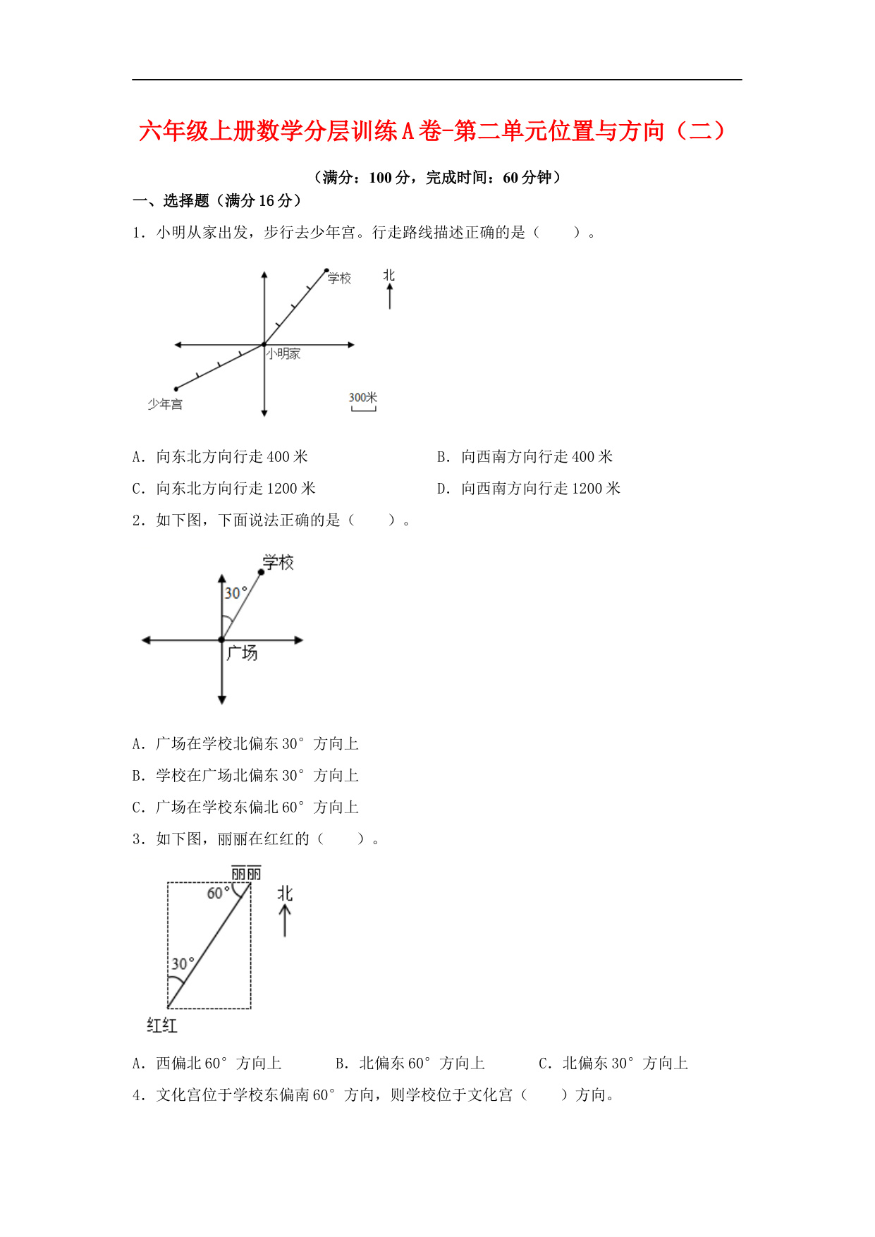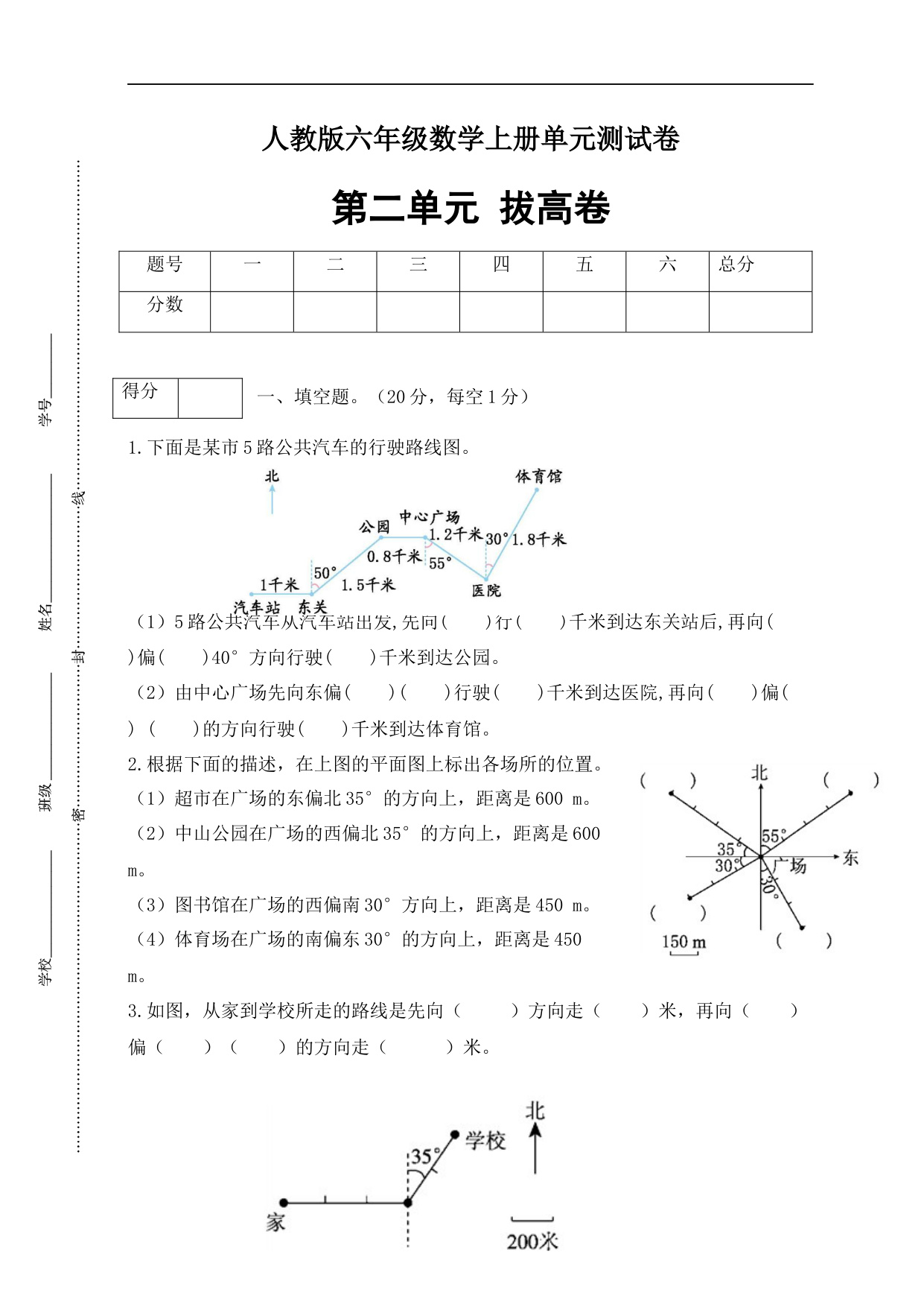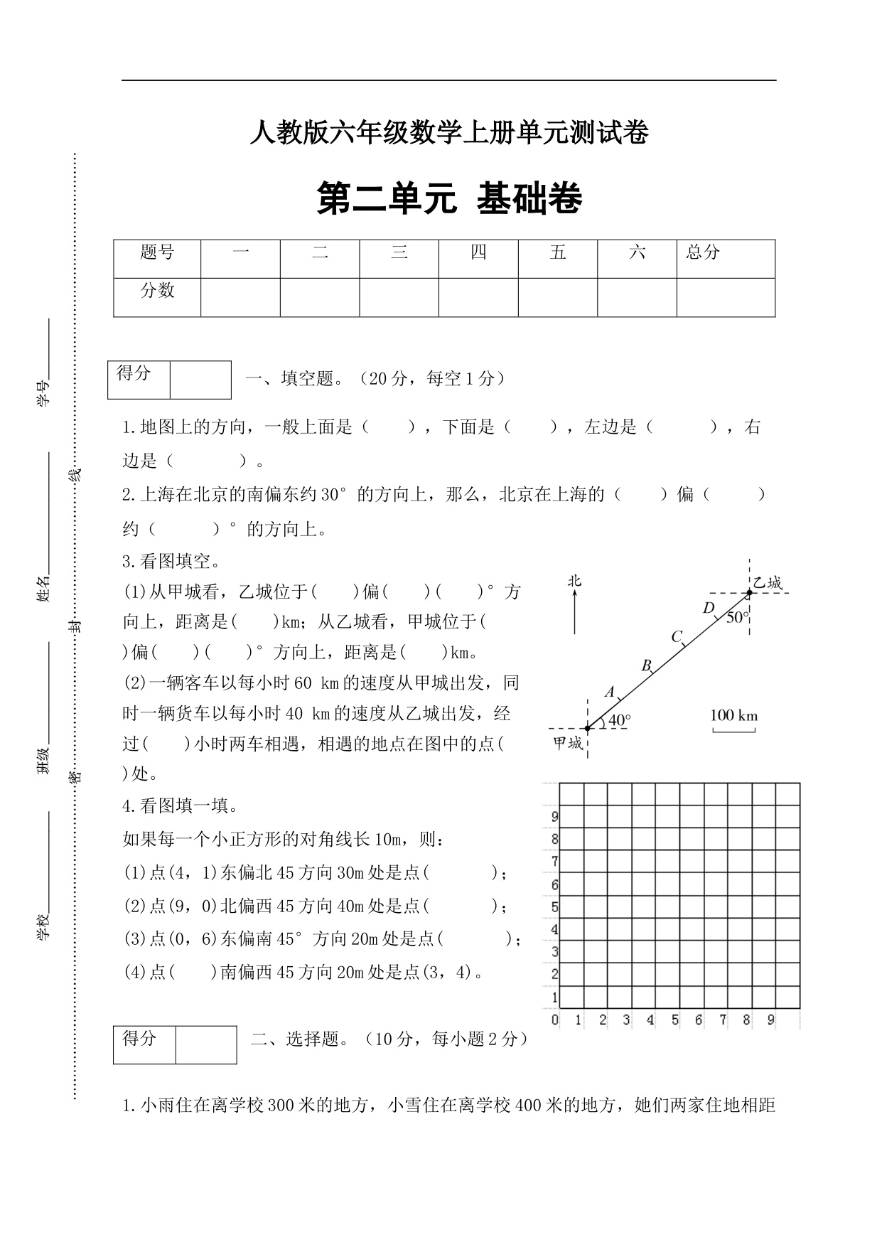 【单元AB卷】六年级上册数学分层训练A卷-第二单元 位置与方向(二)(单元测试) (人教版,含答案)