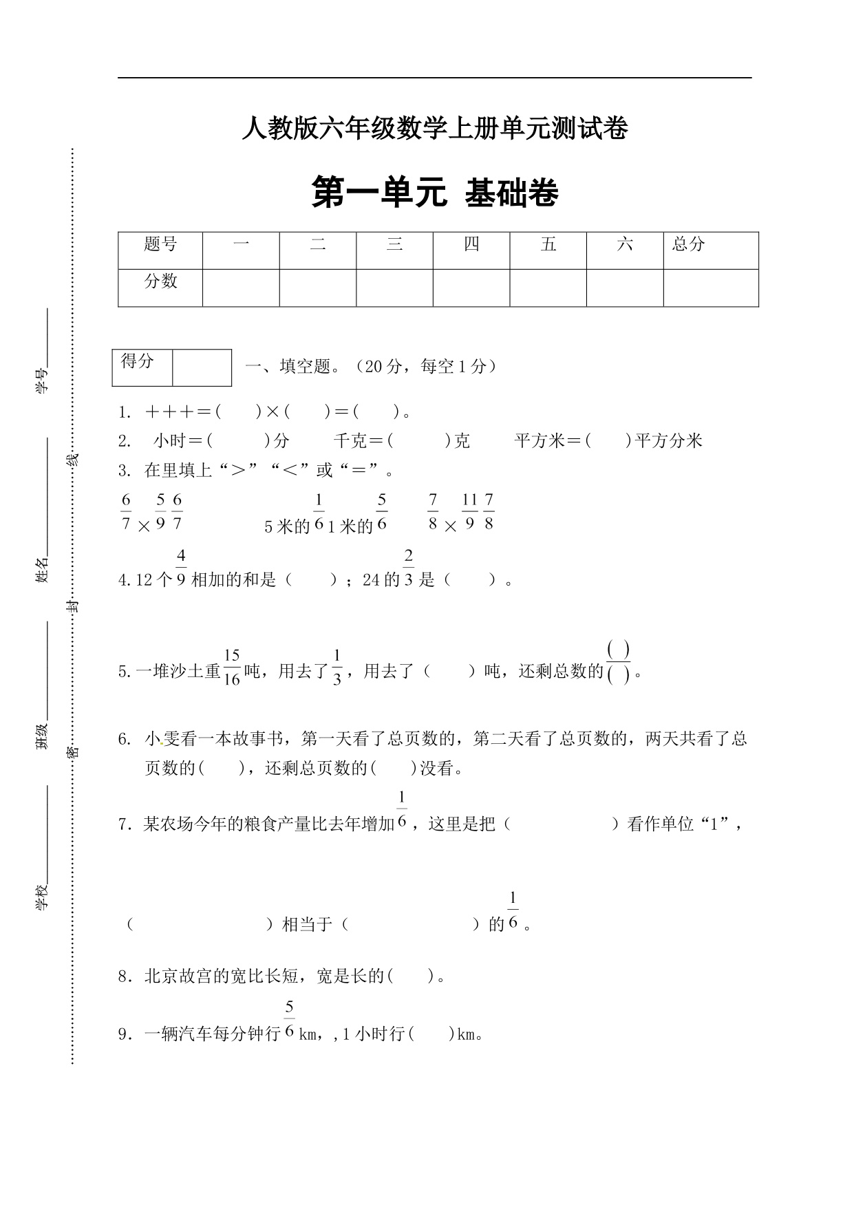 【单元AB卷】六年级上册数学分层训练A卷-第一单元 分数乘法(单元测试) (人教版,含答案)