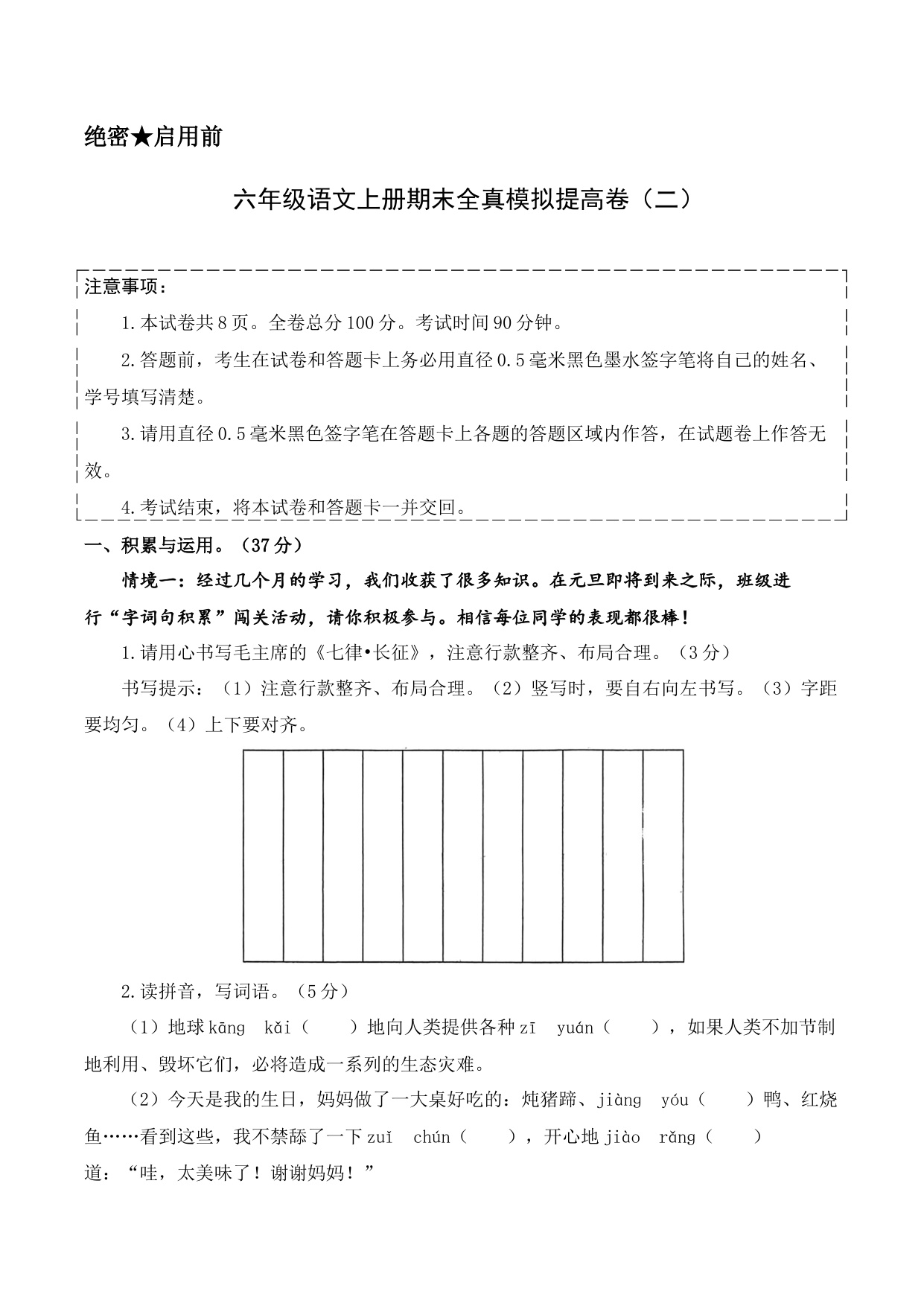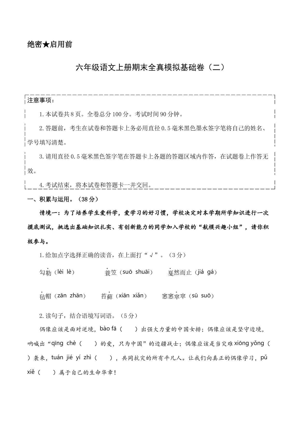 六年级语文上册期末全真模拟基础卷(三)(统编版)A4版
