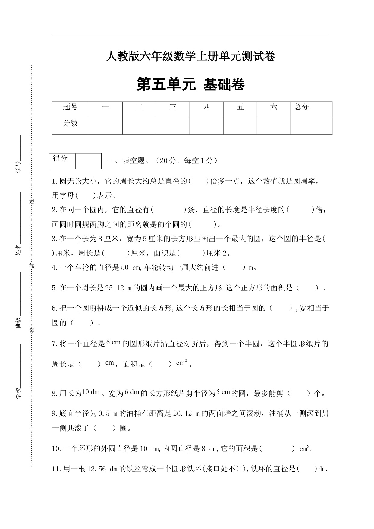 【分层训练】六年级数学上册第六单元测试基础卷 人教版(含答案)