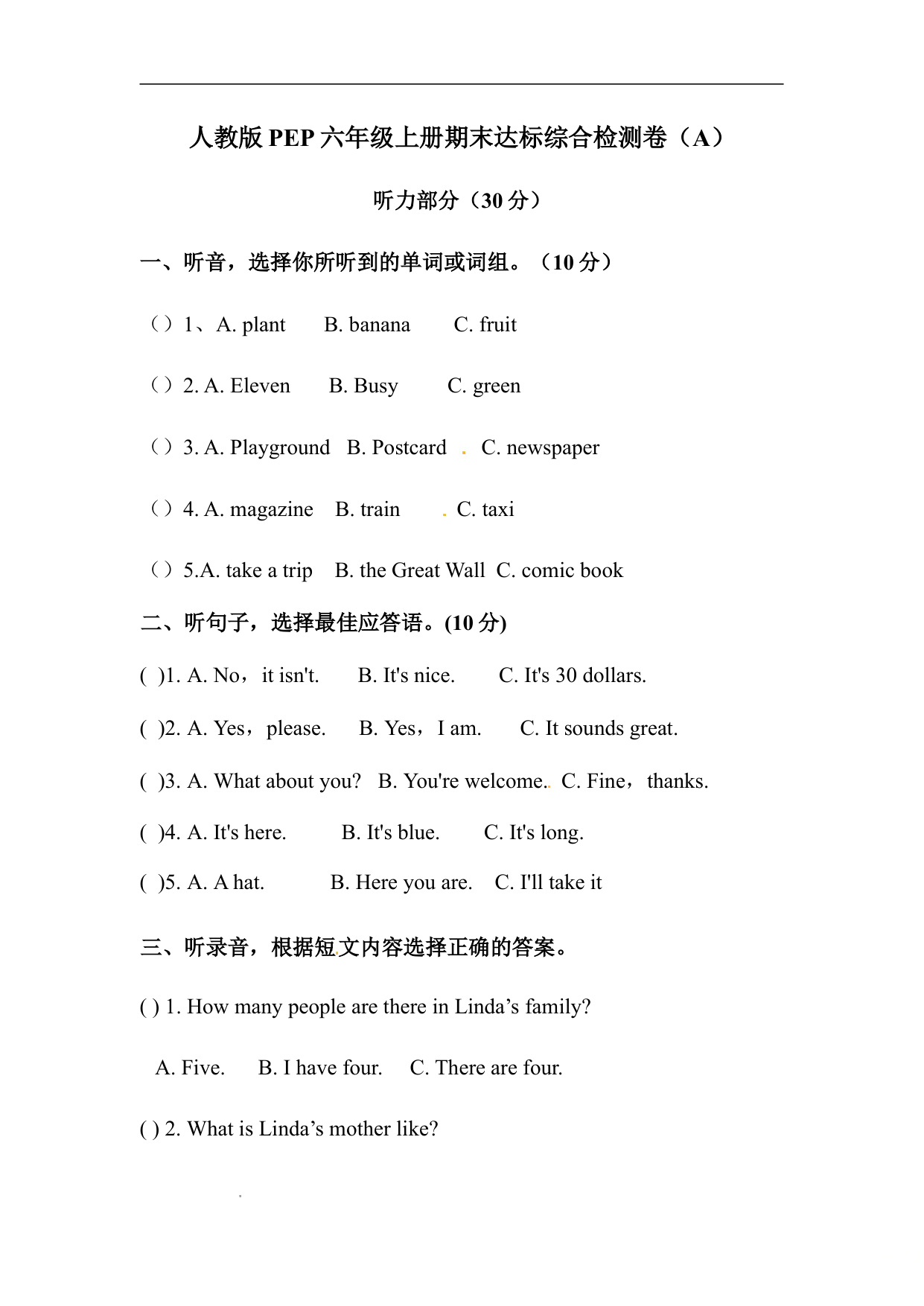 期末达标综合检测卷(B)英语六年级上册人教版PEP (含听力原文和答案)