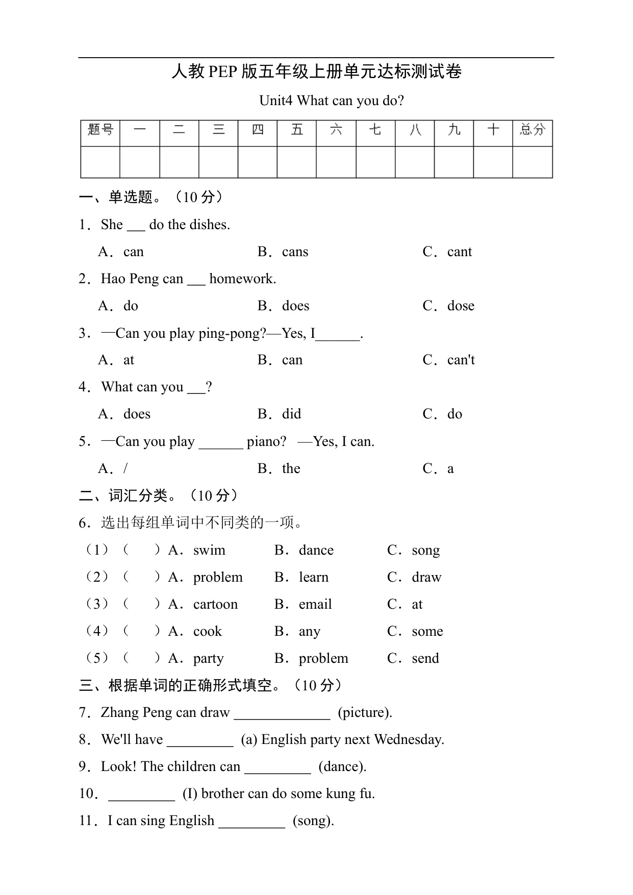人教PEP版五年级上册单元达标测试卷 Unit 4 What can you do?(A卷)