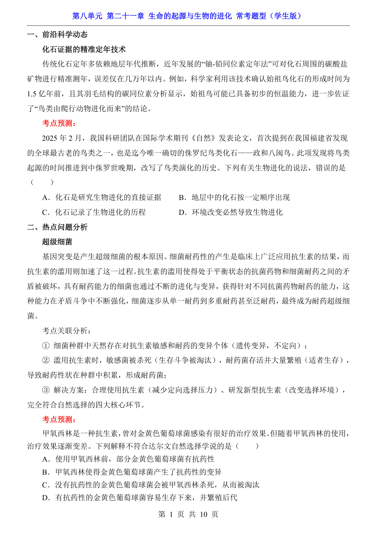 八年级(下)生物第8单元第21章生命的起源与生物的进化 常考题型(苏科版)
