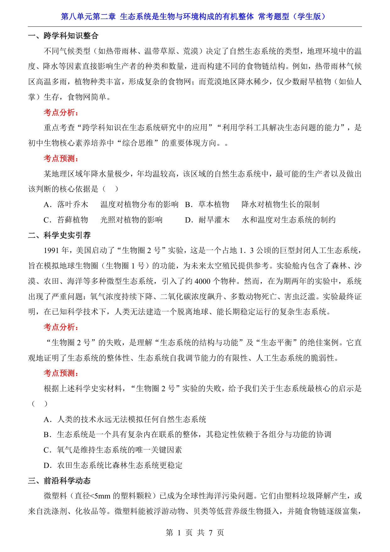八年级(下)生物第8单元第2章生态系统是生物与环境构成的有机整体 常考题型(济南版)