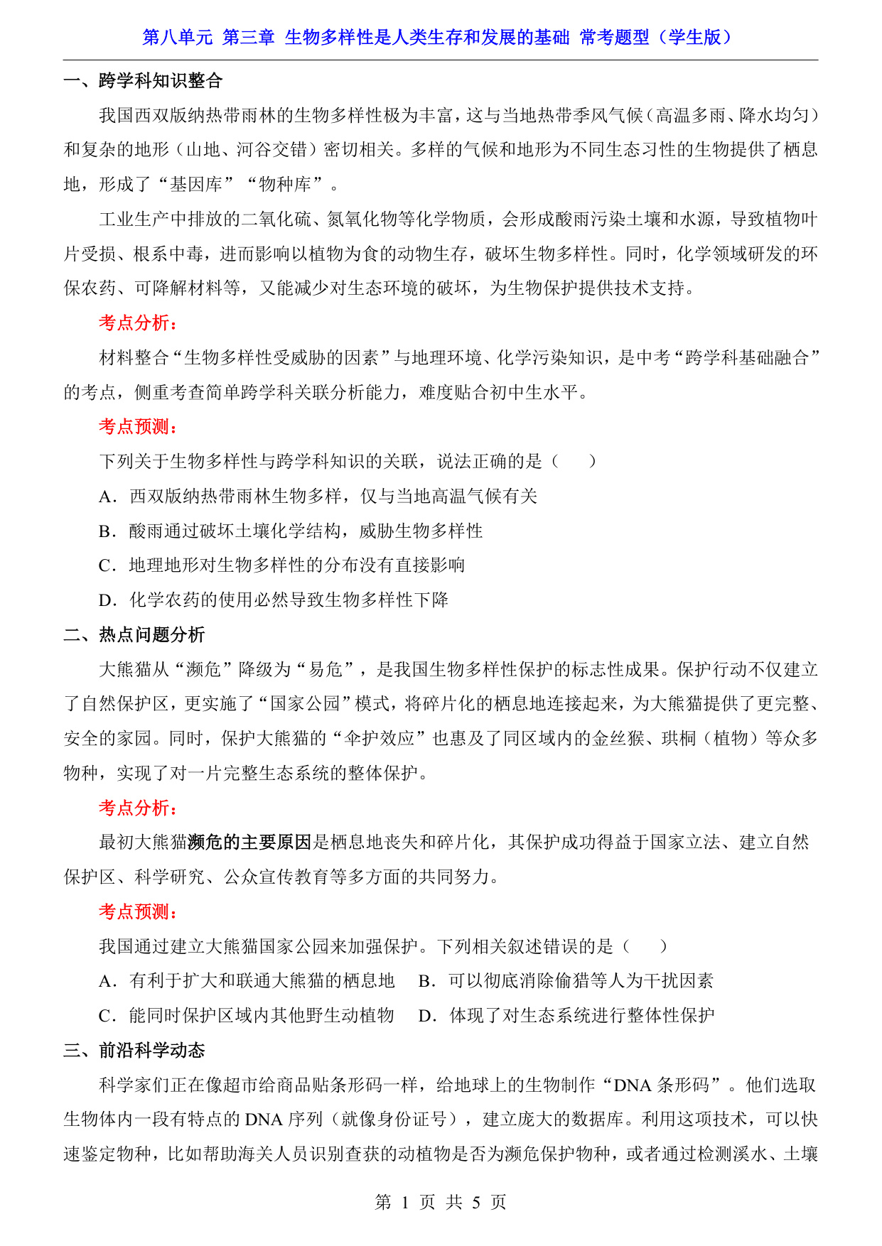 八年级(下)生物第8单元第3章生物多样性是人类生存和发展的基础 常考题型(济南版)