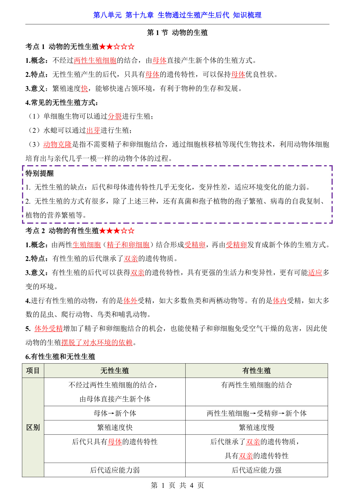 八年级(下)生物第8单元第19章生物通过生殖产生后代 知识梳理(苏科版)