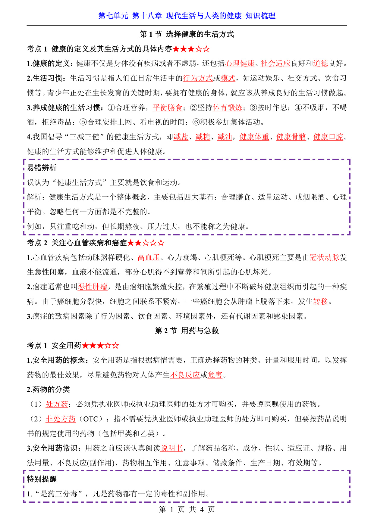 八年级(下)生物第7单元第18章现代生活与人类的健康 知识梳理(苏科版)
