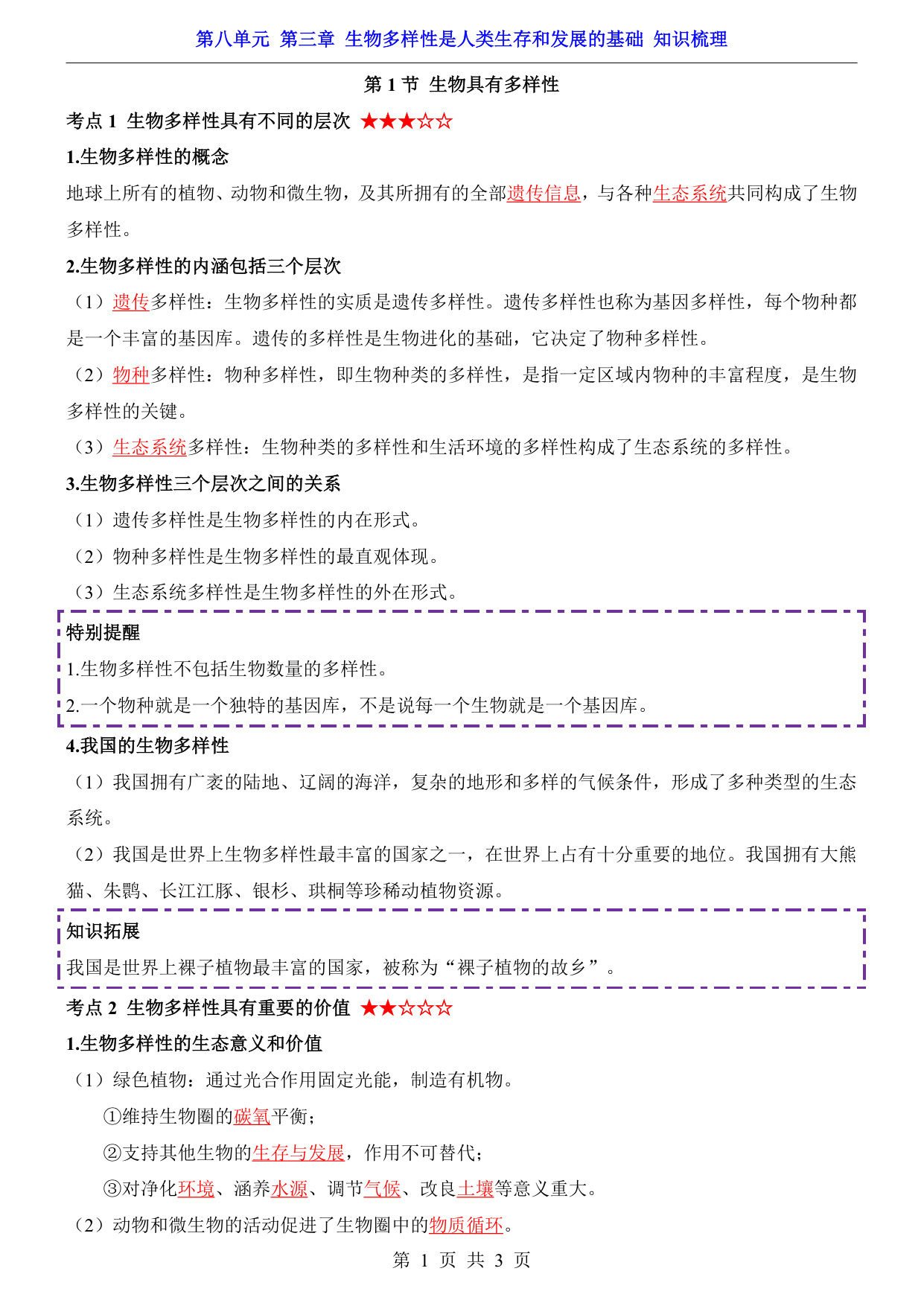 八年级(下)生物第8单元第3章生物多样性是人类生存和发展的基础 知识梳理(济南版)