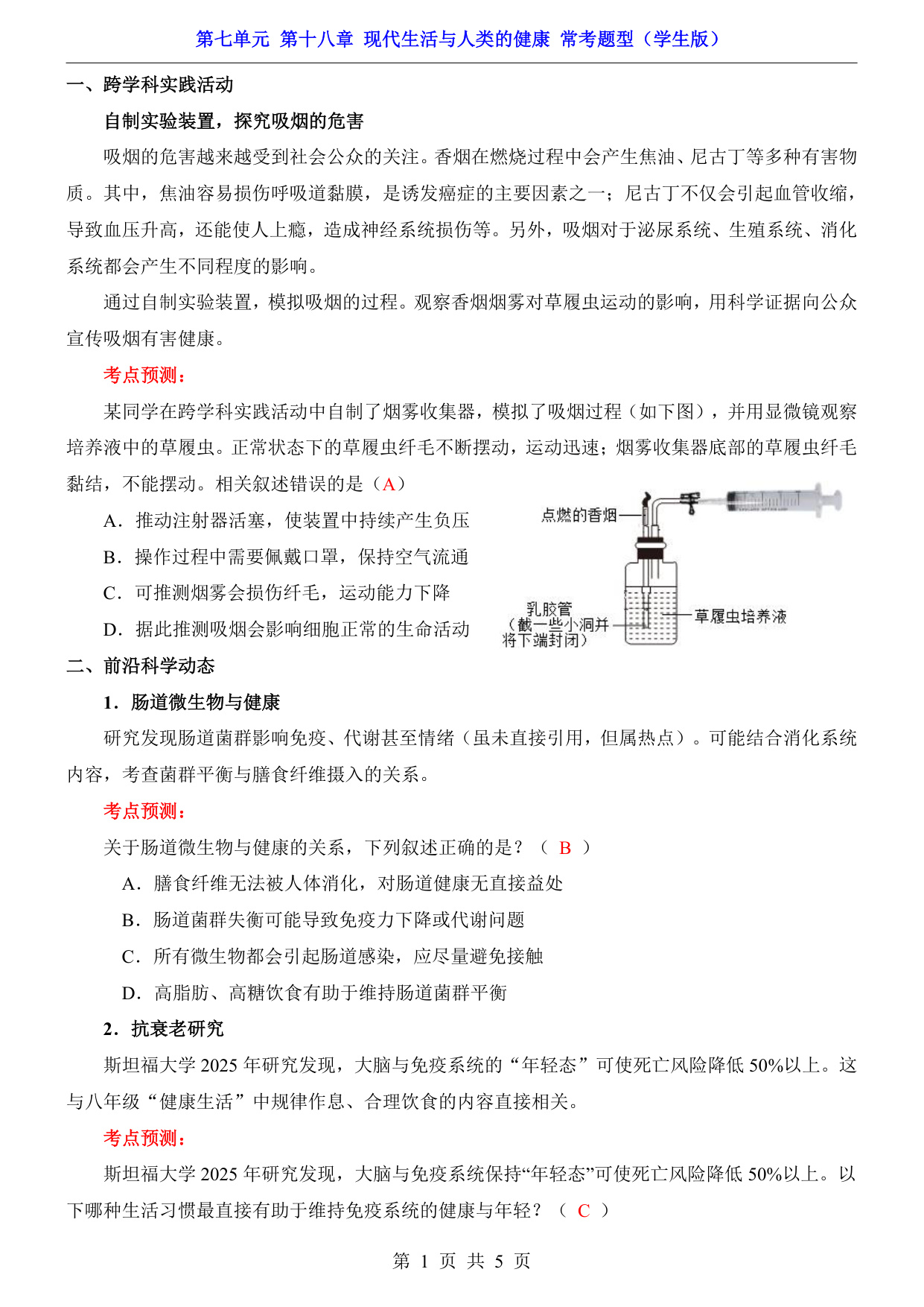 八年级(下)生物第7单元第18章现代生活与人类的健康 常考题型(苏科版)