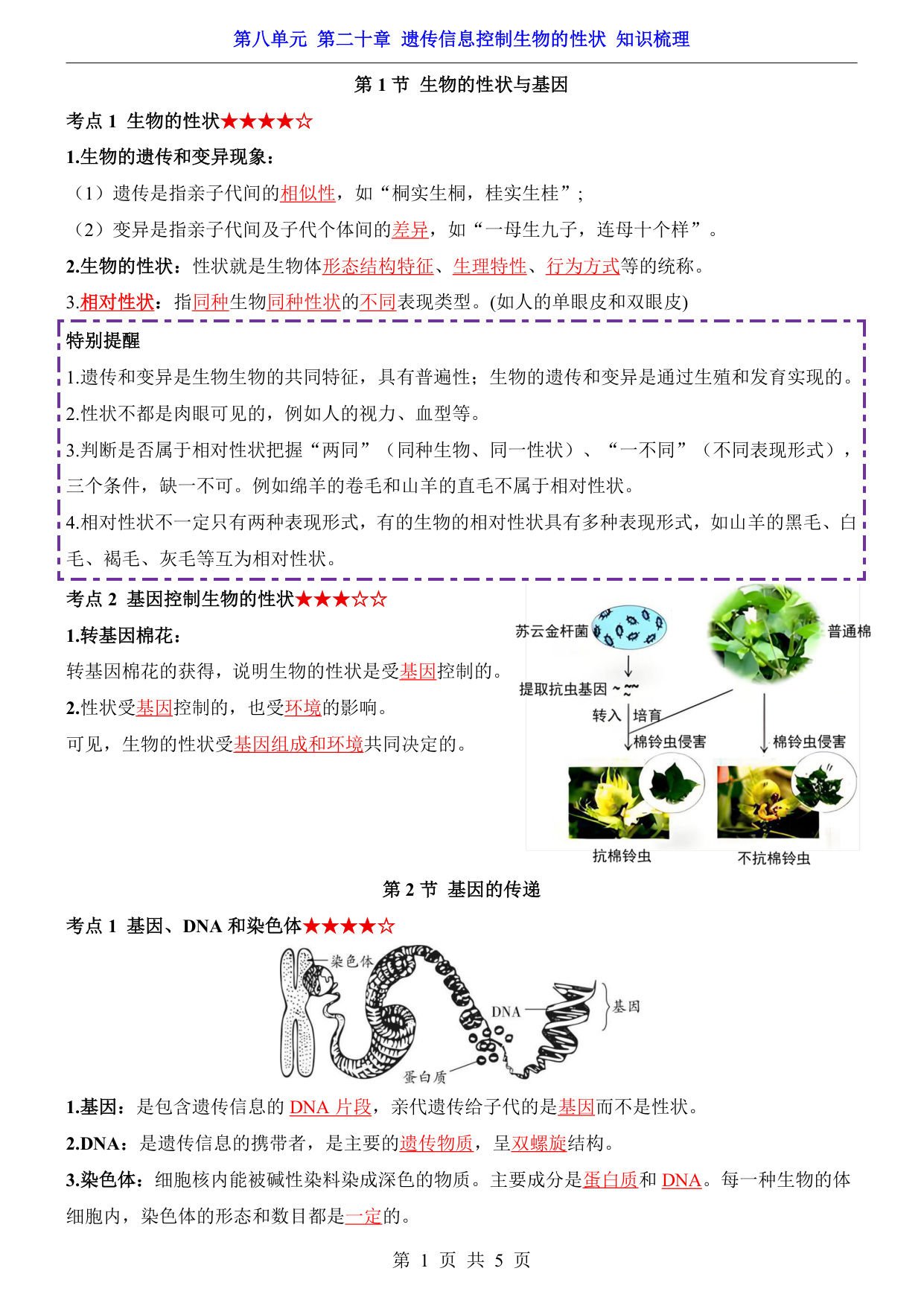 八年级(下)生物第8单元第20章遗传信息控制生物的性状 知识梳理(苏科版)