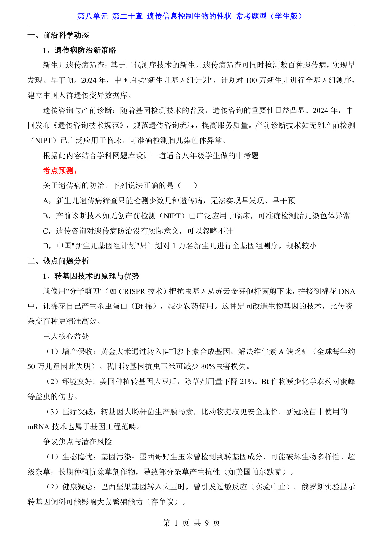 八年级(下)生物第8单元第20章遗传信息控制生物的性状 常考题型(苏科版)
