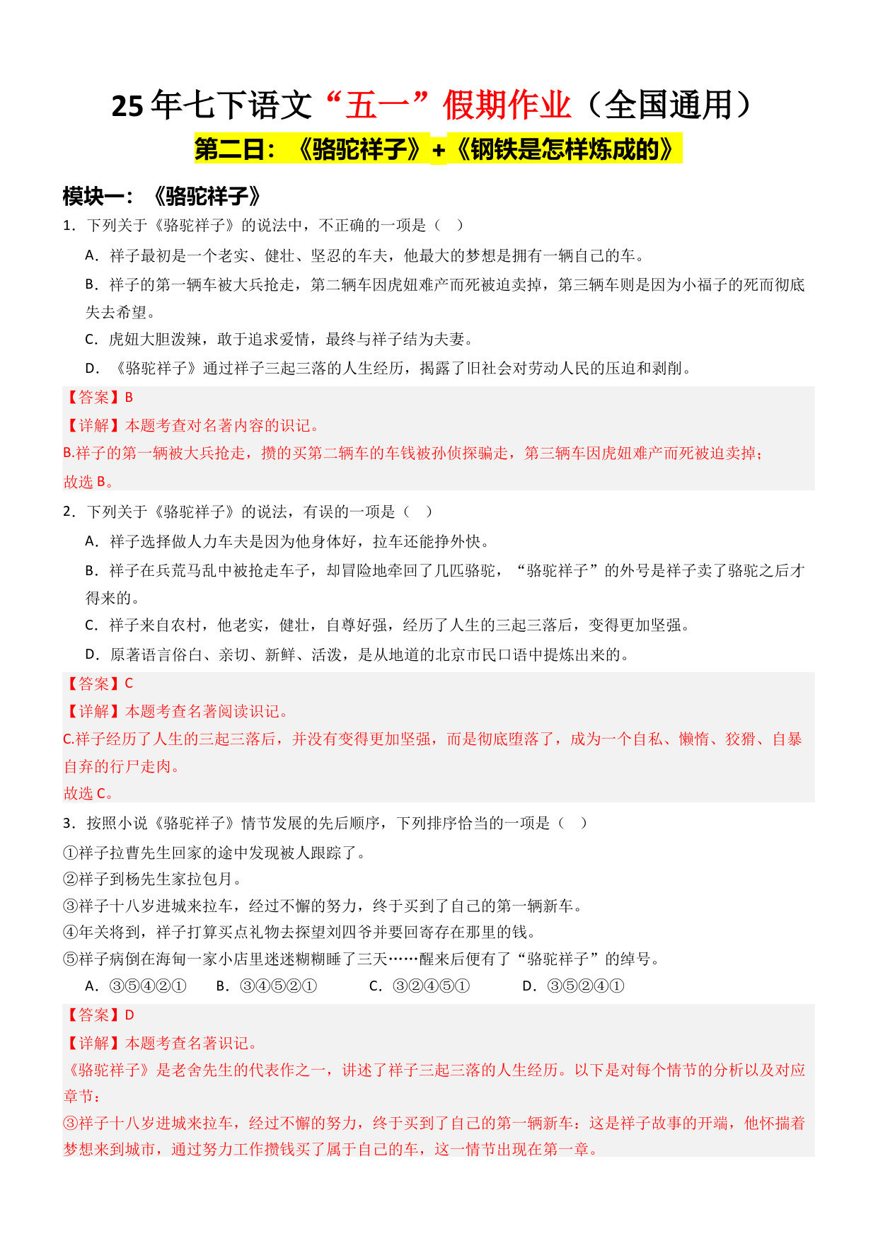 第二日:《骆驼祥子》+《钢铁是怎样炼成的》(解析版)