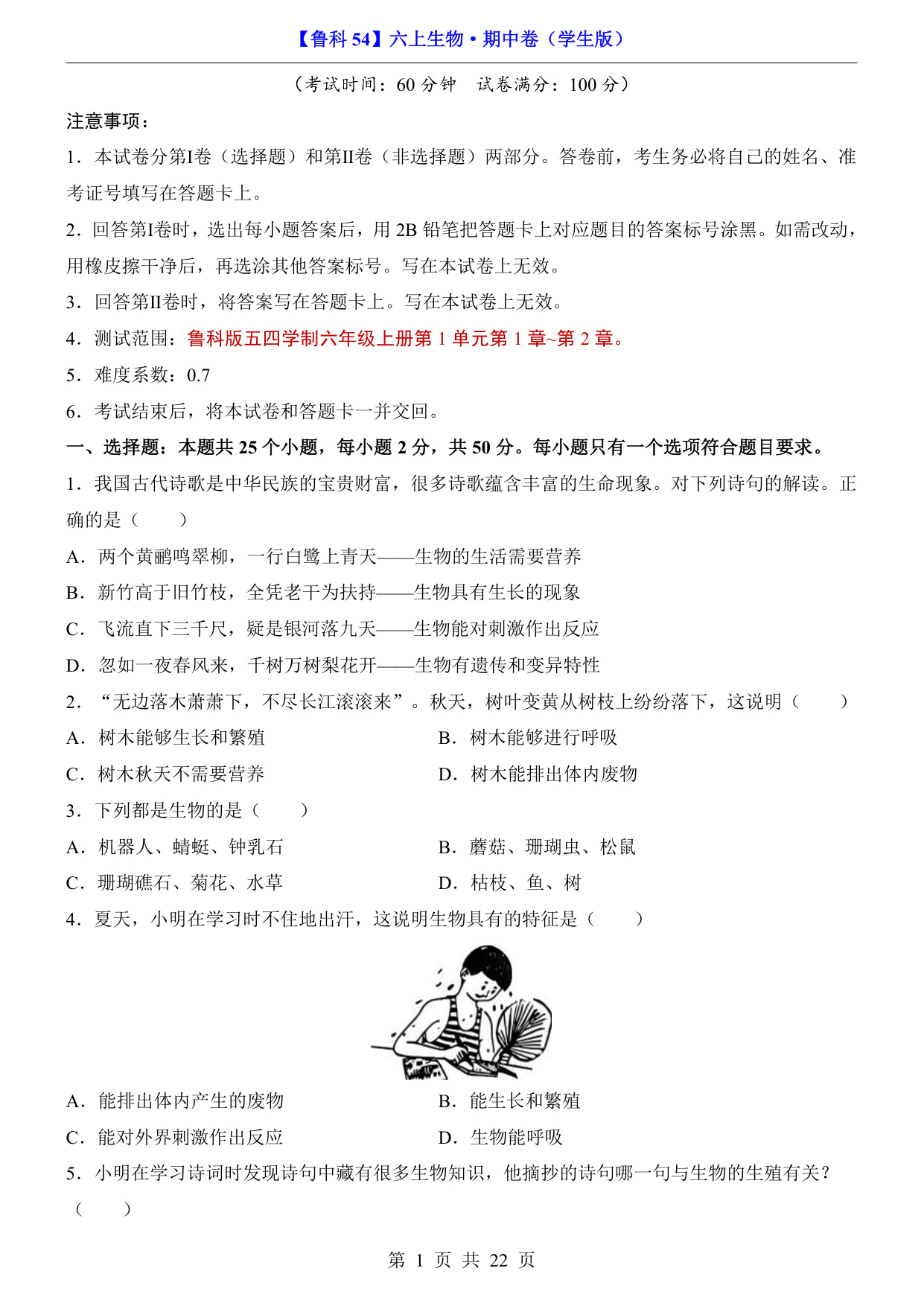 【鲁科54】六上生物单元检测 第1单元 第1章 认识生物(考点卷)