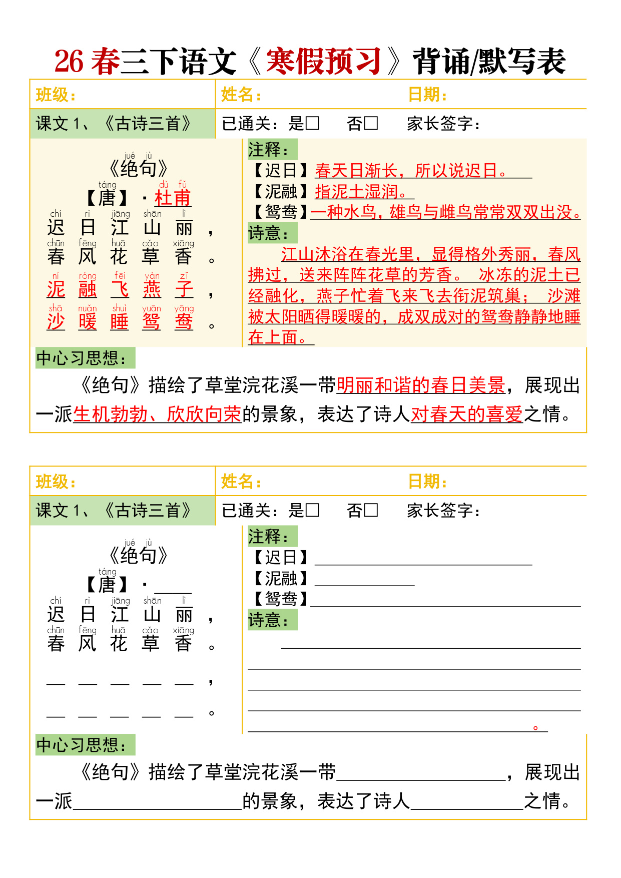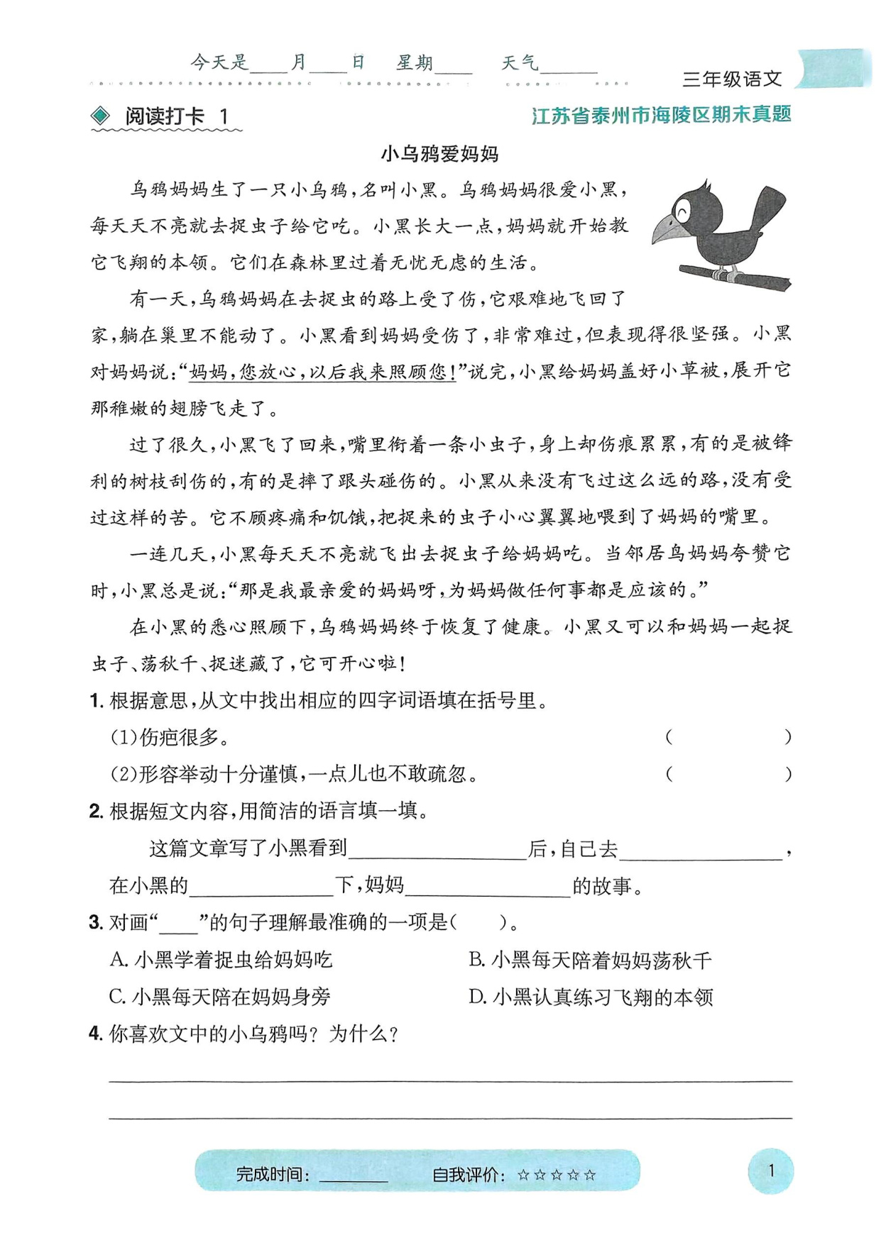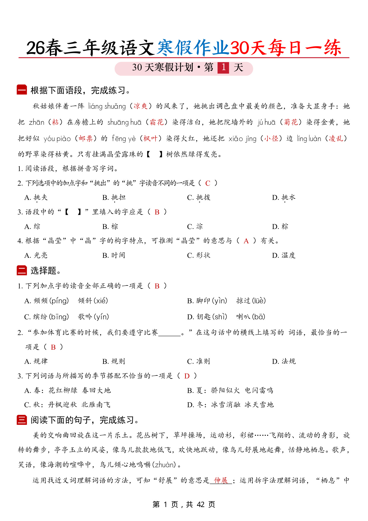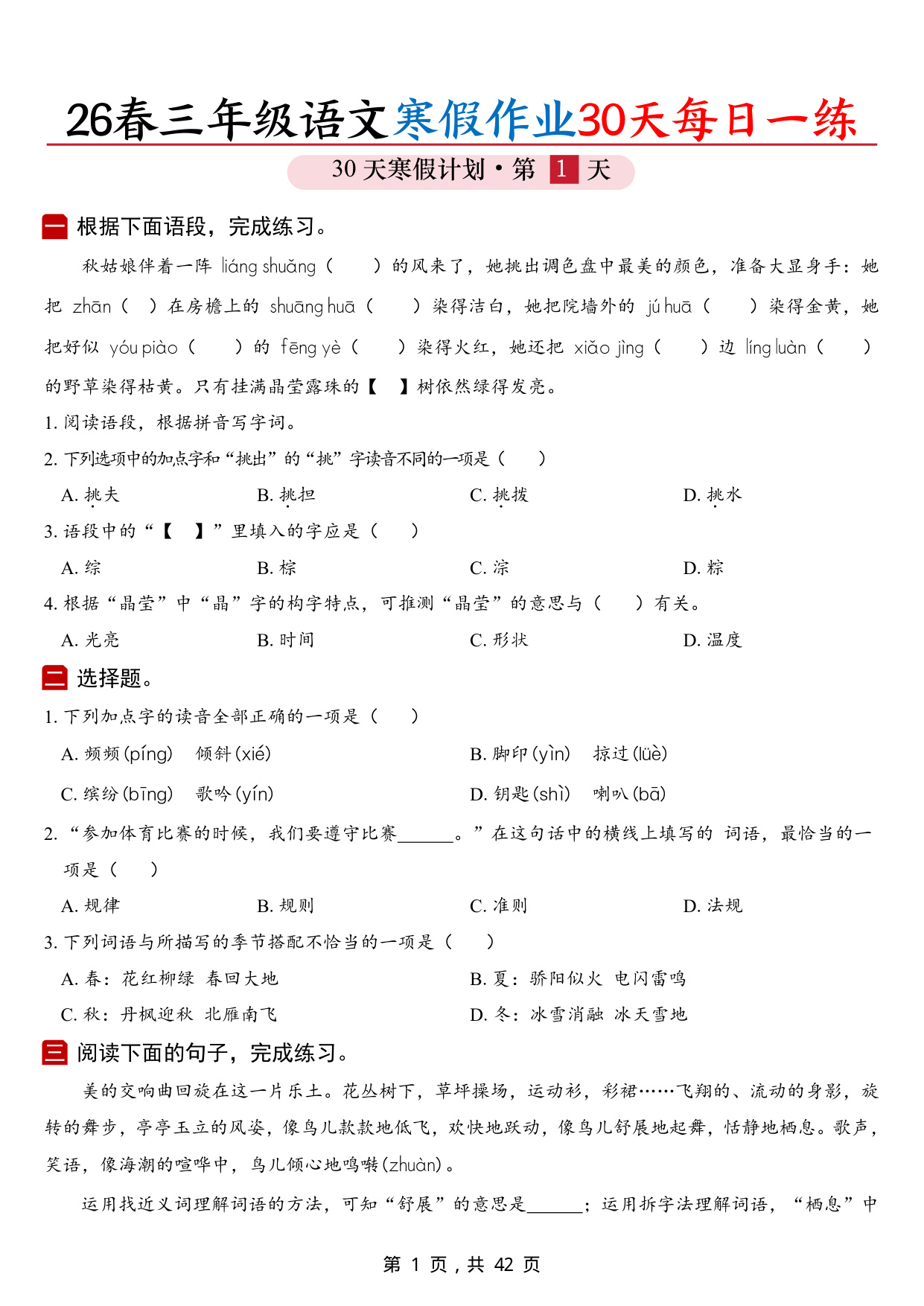 三年级语文寒假作业阅读理解打卡每日一练共20篇